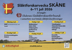 Släktforskare från Skånes Släktforskarförbund finns på plats i läsesalen och kan hjälpa till med släktforskningsfrågor på följande tider: